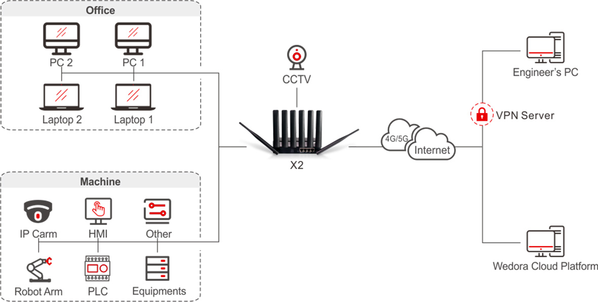 Hongdian provides Hongdian X2 IOT Industrial Gateway to help enterprises realize smart factory. Hongdian X2 has a high-performance processor, easy to handle concurrent tasks, support RS-232/485/448 serial port, and compatible with mainstream industrial machine protocol. With Hongdian’s deep research and development capabilities, powerful software system can also be customized for enterprises to meet all the needs of the intelligent factory. Hongdian X2 could establish a secure VPN tunnel with the VPN server from the remote LAN, which could avoid the cost for the public IP address assignment. Engineers will be able to connect directly from their laptop to the remote factory LAN from anywhere, only need to use a VPN client software to connect to the VPN server. With multiple industrial protocol integrated, X2/A50M acts as a powerful gateway to help the engineer to retrieve data from different kind of devices connected to the router.